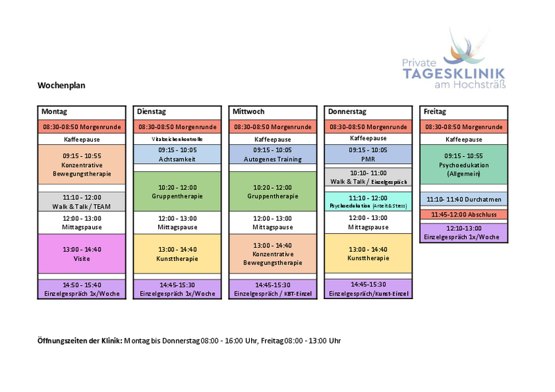 Unser Wochenplan ist darauf ausgerichtet, die unterschiedlichen Therapien in möglichst konzentrierter Form über den Therapietag und die Woche zu verteilen, damit parallel zur tagesklinischen Behandlung noch Freiraum für andere wichtige Aktivitäten, für die Familie oder zur Erholung zur Verfügung steht.